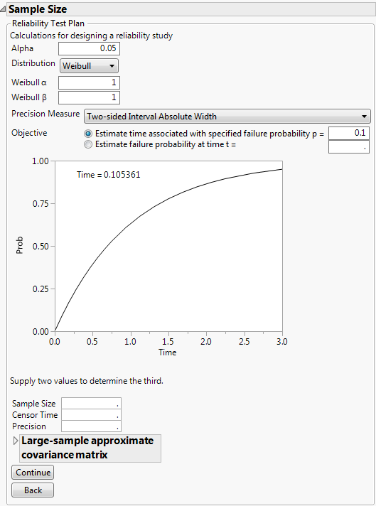 The Reliability Test Plan feature computes required sample sizes, censor times, or precision, for estimating failure times and failure probabilities.