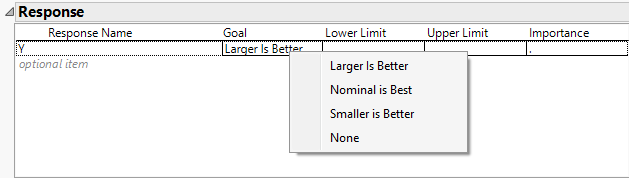Select one of the following Goals: Larger Is Better, Nominal is Best, Smaller is Better, or None. When you create your design, JMP saves a formula for the SN Ratio to the data table that reflects your selected goal.