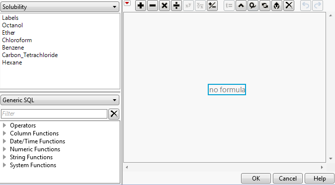 JMP provides help building WHERE clauses for SQL queries during ODBC import. It provides a WHERE clause editor that helps you build basic expressions using common SQL features, allowing vendor-specific functions. For example, you do not need to know whether SQL uses ‘=’ or ‘==’ for comparison, or avg() or average() for averaging.