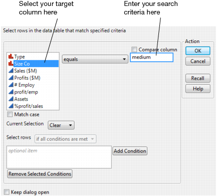 JMP selects all of the rows that have Size Co equal to medium. There are seven.
