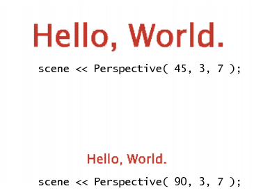 The viewing angle functions in the same way as a wide angle or telephoto lens on a camera. Small viewing angles zoom into a drawing, while wide angles zoom out. In other words, a small viewing angle maps the screen space onto a small portion of the scene, resulting in apparently larger scene elements. A large viewing angle maps the screen space onto a large portion of the scene, resulting in apparently small screen elements. The size of scene elements can therefore be manipulated using the angle argument of the Perspective function. The picture here shows the hello world script with perspective angles of 45 and 90 degrees.