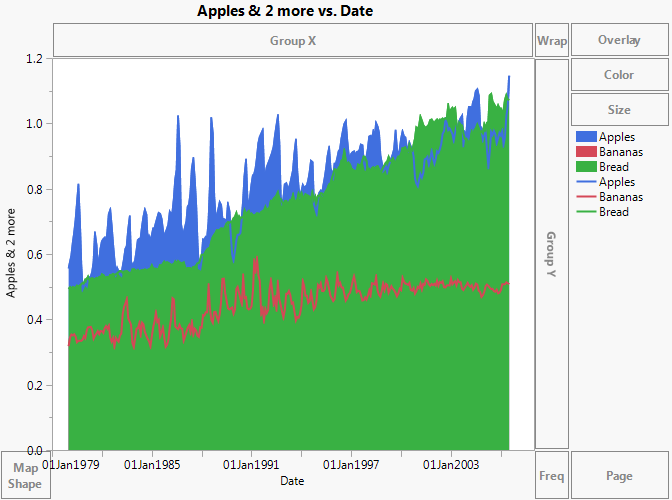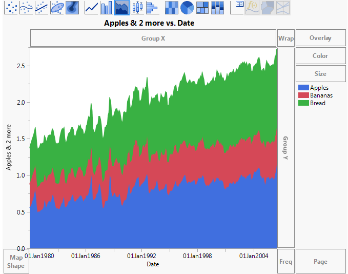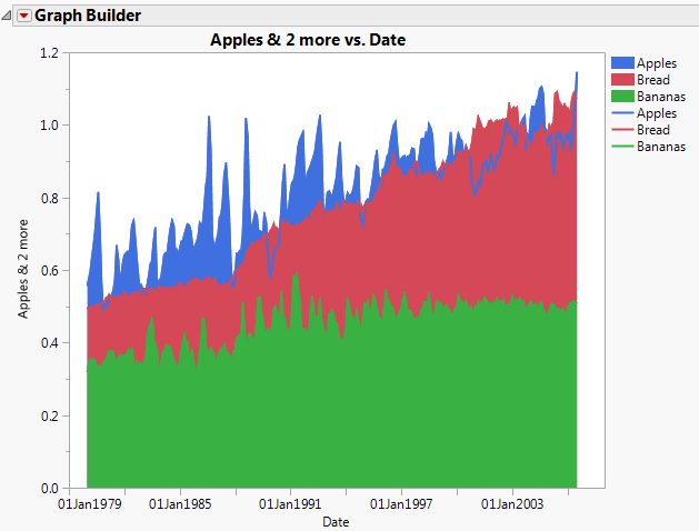 Because banana prices are uniformly smaller than prices for apples and bread, the layer for Bananas is at first entirely hidden behind the other two layers. The apples price is hidden behind the bread price for some months. Use the Line element to see prices for all three clearly.