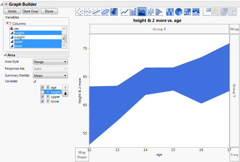 The dark blue line connects the mean heights for each age group. As expected, height tends to increase as age increases. The shaded area shows a range of one standard deviation above and one standard deviation below the mean height at each age group.