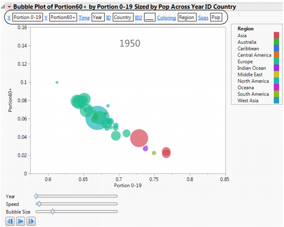To change the variable assigned to a role, click on a blue underlined role name. For example, in Example of Bubble Plot with Show Roles Selected, to change the Coloring variable from Region to Country, proceed as follows: