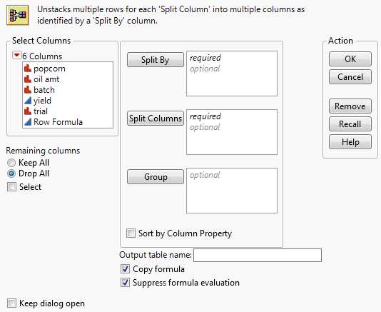 You can create a new data table from the active table by splitting one column into several new columns. This column is split according to the values found in another column, referred to as the Split By column. You can also split columns according to the values of one or more grouping variables.