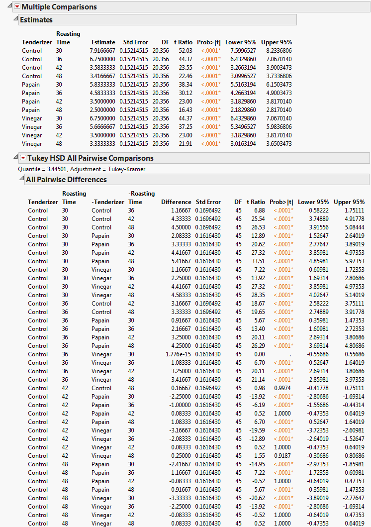 Multiple Comparisons, Partial View shows a partial list of pairwise comparisons. Most of the differences between papain and vinegar that you observed in the profiler are statistically significant. Therefore, it appears that papain is the better tenderizer.