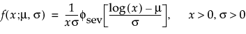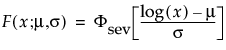 With these parameters, the pdf and the cdf of the Weibull distribution are expressed as a log-transformed smallest extreme value distribution (SEV) using a location-scale parameterization with μ = log(α) and σ = 1/β: