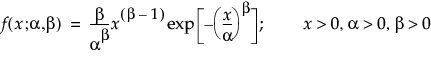 where α is a scale parameter, and β is a shape parameter. The Weibull distribution reduces to an exponential distribution when β = 1.