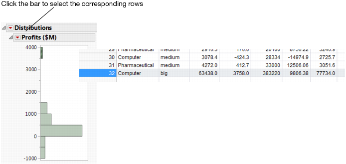 Platform results are connected to the data table. The histogram in Connection between Platform Results and Data Table shows that a group of companies makes a much higher profit that the others. To quickly identify that group, click on the histogram bar for them. The corresponding rows in the data table are selected.