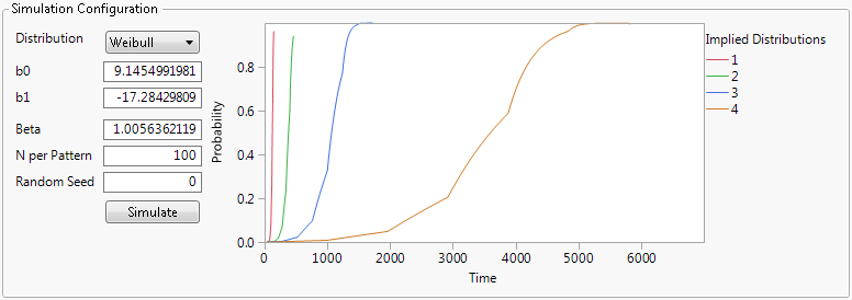 Simulation Configuration Panel shows the Simulation Configuration Panel. The initial values for Distribution and the parameter settings are determined by the parameter estimates for the distribution specified in the Cumulative Damage launch window. The graph shows the estimated failure distribution functions over time for the stress patterns defined in the Stress Pattern data table.