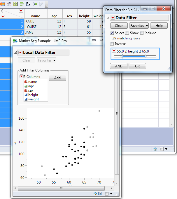For example, using Big Class.jmp, to select the columns for all rows in which the age is 12: