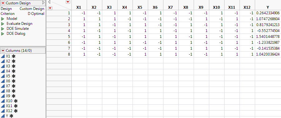 The response column, Y, contains simulated values. These are randomly generated using the model defined by the parameter values in the Simulate Responses window.