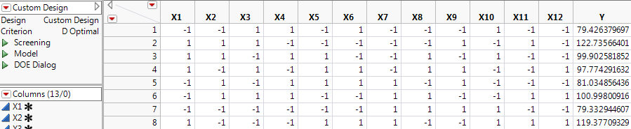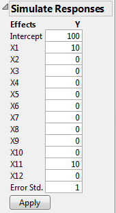 Note: If you did not set the random seed and the number of starts, or if you click Apply more than once, your response values will not match those in Response Column with X1 and X11 Active.