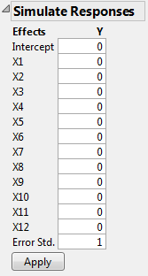 The Simulate Responses window shows coefficients of 0 for all terms, with an Error Std of 1. The values in the Y column currently reflect only random variation. Notice that the model coefficients are set to 0 because not all coefficients are estimable.
