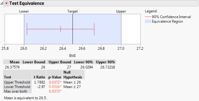 The Test Equivalence report in Equivalence Test Report is for the variable BMI in the Diabetes.jmp sample data table. The Hypothesized Mean is 26.5 and the Difference Considered Practically Zero is specified as 0.5.