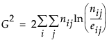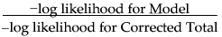 The Likelihood Ratio Chi-square test is computed as twice the negative log-likelihood for Model in the Tests table. Some books use the notation G2 for this statistic. The difference of two negative log-likelihoods, one with whole-population response probabilities and one with each-population response rates, is written as follows: