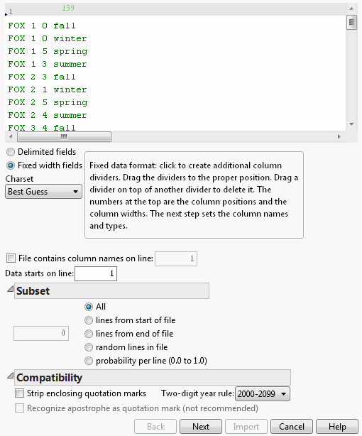 JMP detects the file’s structure and shows options for importing text with either delimiters or fixed width fields. If JMP chooses the wrong file structure, click the Delimited fields or Fixed width fields radio button to import the data as the correct format. (For example, the fixed width window might appear when your file is actually delimited.)