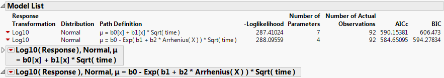 The Destructive Degradation report contains an outline for each model that you fit. When you fit a model, the Model List is updated with a row for that model.