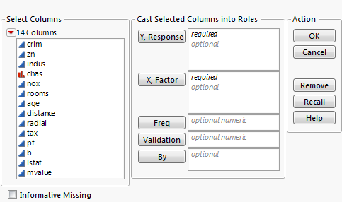 Choose a validation column. For more information, see Validation Method. If you click the Validation button with no columns selected in the Select Columns list, you can add a validation column to your data table. For more information about the Make Validation Column utility, see Make Validation Column Utility in the Predictive and Specialized Modeling book.