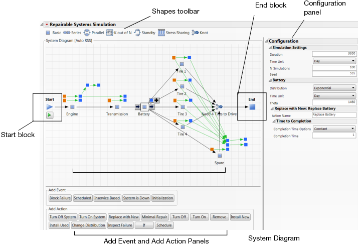 Analyze > Reliability and Survival > Repairable Systems Simulation
