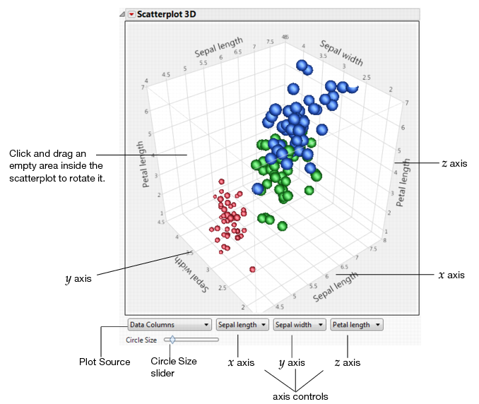 The Scatterplot 3D report shows a three-dimensional spinnable view of your data. See Example of Information Displayed on the Scatterplot 3D Report. In the launch window, you select the variables and then create the report. The variables are displayed on the 3D scatterplots’ x, y, and z axes. Up to three variables can be displayed at a time.