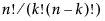This function returns the number of n things taken k at a time (“n choose k”) and is computed in the standard way using factorials, as