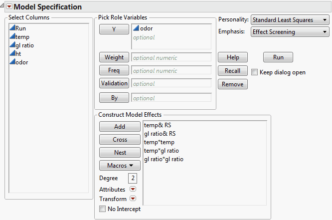 Open the Odor Control Original.jmp sample data table. You want to fit a response surface to model the response, odor, as a function of temp and gl ratio. (Although you could include ht, as shown in the data table script Response Surface, for this illustration do not.)