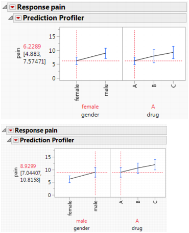Model Fit for a Two-Way Analysis of Variance with No Interaction shows two profiler plots of the fit to the data for the Analgesics.jmp sample data table. The model effects are gender and drug. The response is pain. To obtain this plot, select Analyze > Fit Model, select pain as Y, select gender and drug as model effects, and then click Run. From the report’s red triangle menu, select Factor Profiling > Profiler.
