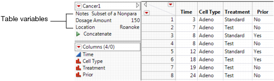 A table variable can contain textual information (for example, source information for the data), or a value that can be used by column formulas or JSL scripts. Table variable names appear in the table panel at the left of the data grid. See Table Variables in the Table Panel.