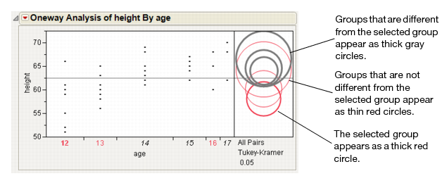 Each multiple comparison test begins with a comparison circles plot, which is a visual representation of group mean comparisons. Visual Comparison of Group Means shows the comparison circles for the All Pairs, Tukey HSD method. Other comparison tests lengthen or shorten the radii of the circles.