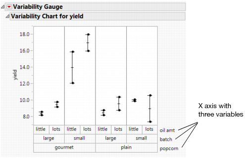 Note: The order in which you assign the variables to the X, Grouping role is important, because the order in this window determines their nesting order in the variability chart.