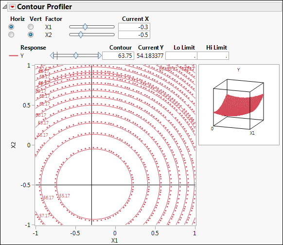 Linking the Contour Profiler to the Prediction Profiler links the Current X values in the Contour Profiler to the X values shown in the Prediction Profiler. The X values in the Prediction Profiler give the critical point where Y is minimized. The crosshairs in the Contour Profiler show the critical point. Notice that the Current Y value is 54.177592, the predicted minimum value according to the Prediction Profiler.