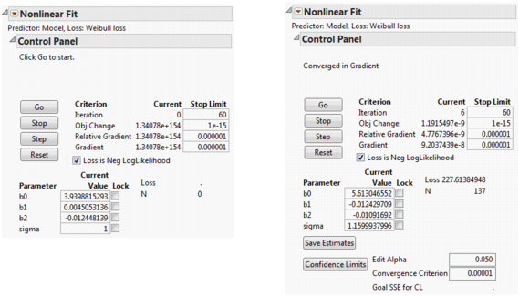 The Nonlinear Fit Control Panel on the left in Nonlinear Model with Custom Loss Function appears. There is now the additional parameter called sigma in the loss function. Because it is in the denominator of a fraction, a starting value of 1 is reasonable for sigma. When using any loss function other than the default, the Loss is Neg LogLikelihood box on the Control Panel is checked by default.