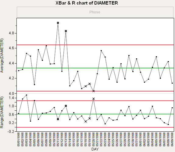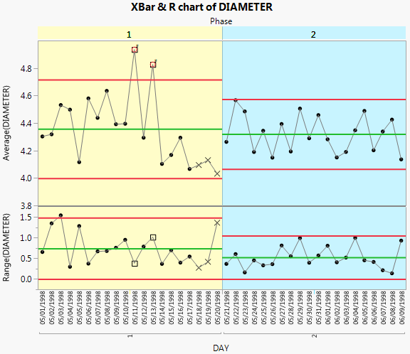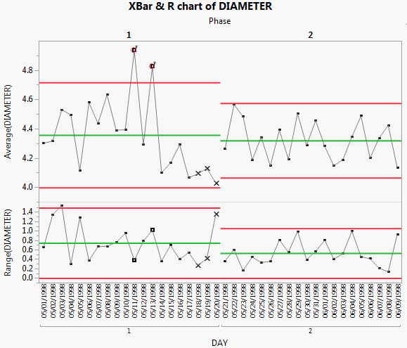Including the Phase variable means that the control limits for phase 2 are based only on the data for phase 2. None of the phase 2 observations are outside the control limits. Therefore, you can conclude that the process is in control after the adjustments were made.