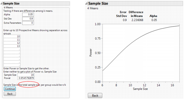 Using the k-Sample Means option, you can compare up to 10 means. Consider a situation where 4 levels of means are expected to be in the range of 10 to 13, the standard deviation is 0.9, and your sample size is 16.