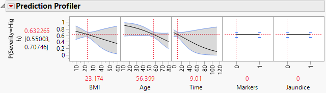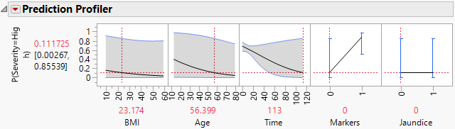 Note: The predictor Hepatitis is not shown in the profiler because it does not appear in any active (nonzero) terms. Because Markers and Jaundice appear in active interaction terms, they appear in the profiler even though, as main effects, they are not active.