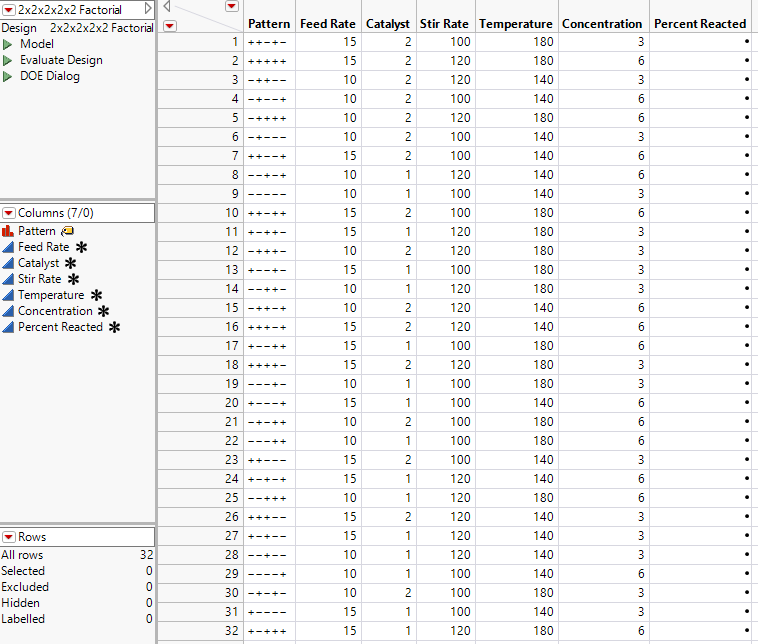 The first column in the design data table shows the factor level combination for each run in terms of + and - signs, indicating high and low factor settings. The table also has an empty Y column named Percent Reacted for entering response values as you conduct the experiment.