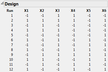 The Alias Matrix shows how the coefficients of the main effect terms in the model are biased by potentially active two-factor interaction effects. The column labels identify interactions. For example, in the X1 row, the column X2*X3 has a value of 0.333 and the column X2*X4 has a value of -0.33. This means that the expected value of the main effect of X1 is the sum of the main effect of X1 plus 0.333 times the effect of X2*X3, plus -0.33 times the effect of X2*X4, and so on, for the rest of the X1 row. In order for the estimate of the main effect of X1 to be meaningful, you must assume that these interactions are negligible in size compared to the effect of X1.