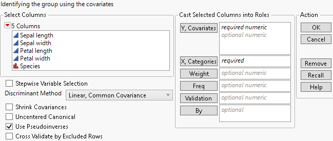 Figure 4.3 Discriminant Launch Window for Iris.jmp