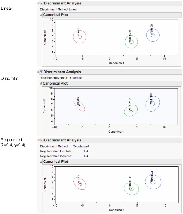 Assigning 0 to each of these two parameters is identical to requesting quadratic discriminant analysis. Similarly, assigning 1 to Lambda and 0 to Gamma requests linear discriminant analysis. Use Table 4.1 to help you decide on the regularization. See Figure 4.7 for examples of linear, quadratic, and regularized discriminant analysis.