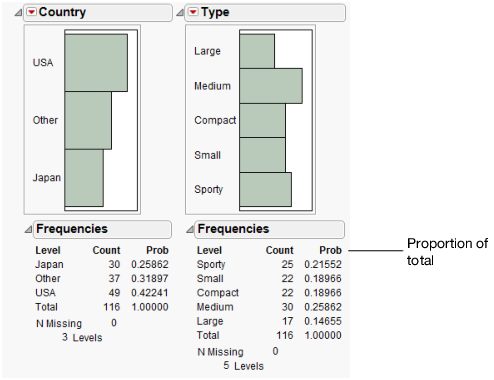 The report window includes a bar chart and a Frequencies report for Country and Type. The bar chart is a graphical representation of the frequency information provided in the Frequencies report. The Frequencies report contains the following:
