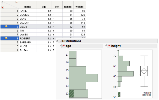 The Distribution report window is interactive. Clicking on a histogram bar highlights the corresponding data in any other histograms and in the data table. See Figure 2.1.