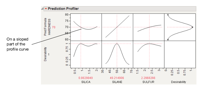 We get the following Prediction Profiler display. Notice that the SILICA factor’s optimum value is on a sloped part of a profile curve. This means that variations in SILICA are transmitted to become variations in the response, HARDNESS.