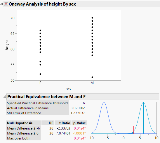 This example uses the Big Class.jmp sample data table. Examine if the difference in height between males and females is less than 6 inches.