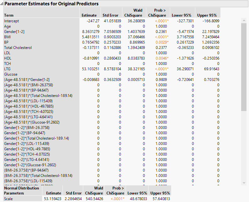 This option highlights the nonzero terms in the Parameter Estimates for Original Predictors report (Figure 5.3) and their paths in the Solution Path Plot. The corresponding columns in the data table are also selected. Note that only 7 of the 55 parameter estimates are nonzero. Also note that the scale parameter for the normal distribution (sigma) is estimated and shown in a separate table at the bottom of the Parameter Estimates for Original Data report.