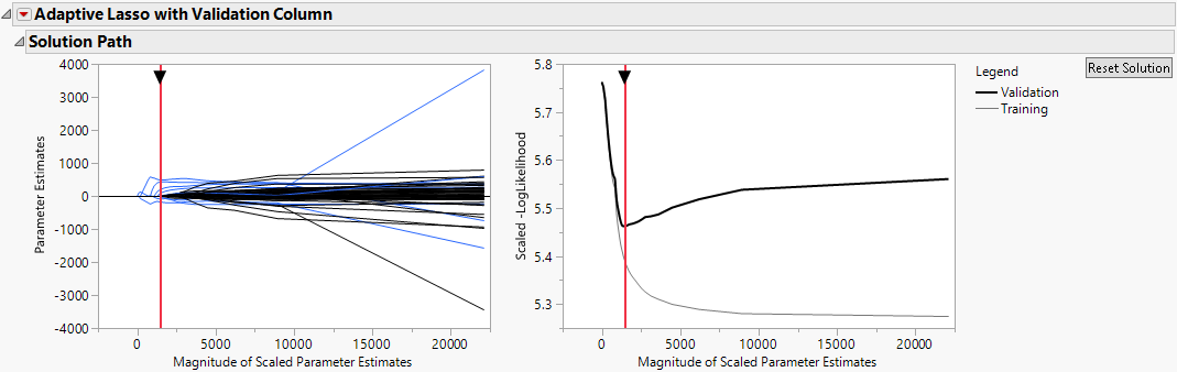 An Adaptive Lasso with Validation Column report appears. The Solution Path report (Figure 5.2) shows plots of the parameter estimates and scaled negative log-likelihood. The shrinkage increases as the Magnitude of Scaled Parameter Estimates decreases. The estimates at the far right of the plot are the maximum likelihood estimates. A vertical red line indicates those parameter values selected by the validation criterion, in this case, the holdback sample defined by the column Validation.