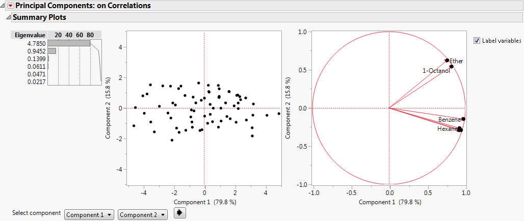 The report gives the eigenvalues and a bar chart of the percent of the variation accounted for by each principal component. In this example, the first principal component accounts for almost 80% of the variation in the data. Together, the first two principal components account for almost all of the variation in the data (95.6%). There is a Score Plot and a Loadings Plot as well. See Principal Components Report for details.