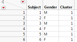 The cluster information is merged into the Subject data table. The columns in the Subject data table are now Subject, Gender, and Cluster, as shown in Figure 4.35.