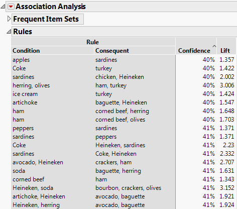 The Frequent Item Sets report shows that 36% of customers purchased avocados. The Rules report in Figure 20.2 shows that 58% of these customers also bought artichokes. Because of the large proportion of customers who follow this behavior, the grocery store management might use this information to strategically locate avocados and artichokes.