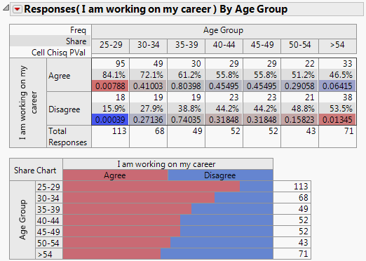 For example, the expected number of responses in the 25 through 29-year-old group who agree is (287*113)/448 = 72.4; the observed value was 95. This observed value, with a p-value of 0.00788, is significantly larger than the expected value. The number of responses in the 25 through 29 group who agree with “I am working on my career” is higher than expected were the response to this question was independent of age.